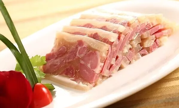 水晶肴蹄,又名水晶肴肉,是江苏镇江的一款名菜,迄今已有300多年的历史。水晶肴蹄成菜后肉红皮白,光滑晶莹,卤冻透明,犹如水晶,故有“水晶”之美称。食用时,具有瘦肉香酥、肥肉不腻、酥香嫩鲜等特点,佐以姜丝和镇江香醋,更是别有一番风味。有诗赞曰:“风光无限数今朝,更爱京口肉食烧,不腻微酥香味溢,嫣红嫩冻水晶肴。”