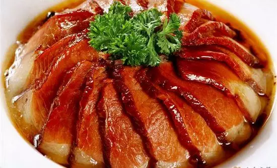 用肥鸭熏制而成。成菜色泽金黄,皮脂厚润,肉质鲜嫩,气味芳香,别有风味。菜肴简介无为熏鸭名贯古今、盛誉不衰的原因为二:一是鸭好,无为县地处长江沿岸,乃半丘陵半圩之地势,鸭以在野外放养,多食小鱼、小虾等活食,收稻后,鸭于水稻田裏觅食,故鸭成长快、体服壮、肉嫩、脂厚;二是制法精良,操作细,成品体形完美,色泽金黄油亮,皮酥肉嫩,味鲜醇,并有烟熏幽香。若醮醋食用,风味尤佳。无为熏鸭最初的由来还跟朱元璋有关系。原来明太祖朱元璋小的时候家穷,给人家放牛。但是东家不给他吃饱肚子,所以一群放牛童聚在一起,便干起捉野鸭子的活计来了。他们不敢带回家去吃,就在野外割些茅草,架起火来熏烤。有时烤不熟,便埋在火灰裏,等第二天扒出来,鸭肉又香又烂,好吃极了。后来,这一做法在民间流传开来,并由安徽省无为县卖牛肉的回民马常有发扬光大,还摸索出用锯末熏鸭的独特制作工艺,从此无为的马常有清真熏鸭生意做大了,而“无为熏鸭”成了风靡全国的地方风味食品。
