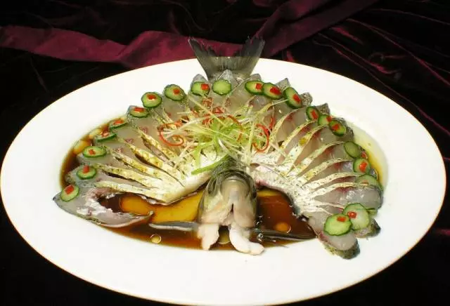 “清蒸武昌鱼”是选用鲜活的樊口团头鲂为主料,配以冬菇、冬笋、并用鸡清汤调味。成菜鱼形完整、色白明亮、晶莹似玉;鱼身缀以红、白、黑配料,更显出素雅绚丽。