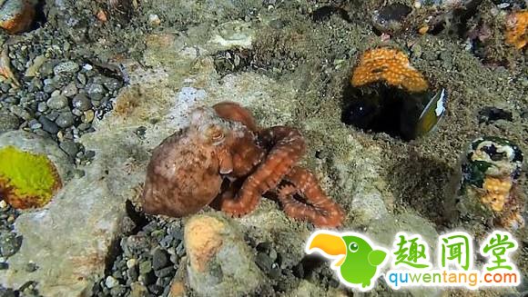 印尼海域一大章鱼收缩触手钻进小洞