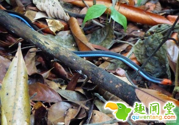 ▼蓝长腺丽纹蛇全身呈现具有光泽感的宝蓝色,头部和尾部则是鲜艳的红色。