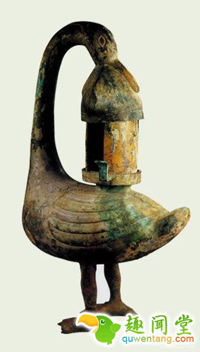 此为大汉朝节能环保无烟雁鱼铜灯。这种造型的铜灯相对来说很常见,那么它到底牛逼在哪儿呢?牛逼在它的设计。灯由衔鱼的雁首、雁身、两片灯罩及带曲鋬的灯盘四部分组成,可拆卸。两灯罩可自由转动,能调节灯光照射方向和防御来风。雁腹内可盛清水,灯烟经雁颈溶入水中,可减少油烟污染。