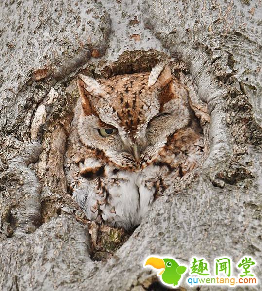 这只猫头鹰显然不想被打扰,它挑选了一个完美的地方小睡——将自己伪装在了一棵树的树洞中。听到快门声后,它睁开了一只眼睛,看了一眼摄影师,然后又合上了眼睛,接着睡。安德烈说,它伪装得很好,大约在一棵25英尺(约7.6米)高的树上,我一开始都没有发现它。被惊醒了后,它看起来有些恼火