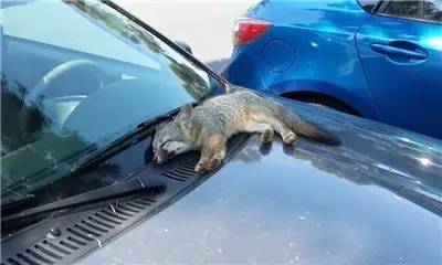 3.车盖上睡着的狐狸崽子。