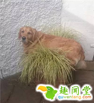 4.金毛挂在盆栽上。