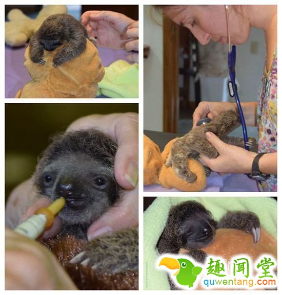 上图是一只名为雪碧的树懒孤儿。雪碧掉落到地上被发现,当时它营养不良,有生命危险,工作人员隔三小时就得喂它羊奶。