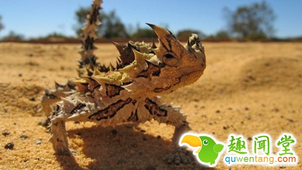 这种生活在澳洲的棘蜥,长度大约是20cm,可以活上15~20年,并有着像着怪物的外表,全身上下充满着棘刺,就像是会走路的仙人掌一样,还有着先进的皮肤迷彩,可以随着太阳日照角度不同变色。有趣的是,它舌头细长,只能黏着小只昆虫,就算走过绿洲,也没办法喝上一口,难道说这种生物真的不用喝水也能生存吗?