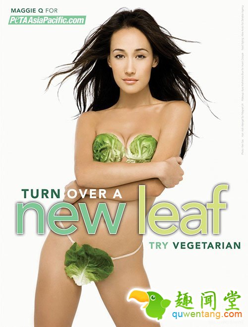 Maggie Q为其做宣传活动的时候全裸出镜,只用菜叶子遮盖身体