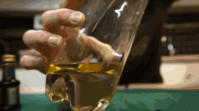往瓶子里倒水和油,比例为3 : 1。