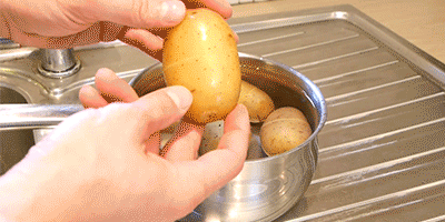 4.围绕你土豆中心剥。将表皮煮沸,当它们完成后,将它们在冷水中冲洗,用你的手指剥下一层皮。
