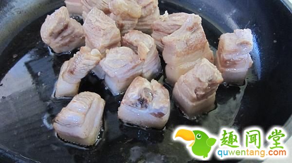 1、将五花肉切成两三厘米见方的大块?!咀⒁猓呵谐烧叫危竺嫖一崴档轿衤搿?/p>