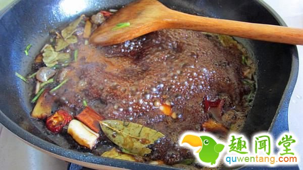 4、刚才的锅不用洗,把油烧热,放入葱,姜,蒜,桂皮,香叶,山楂,爆香。后放入黄酒酱油冰糖炒糖色。改小火。炒到汤颜色变红,气泡由大变小后倒入肉翻炒。裹上酱油和调料。