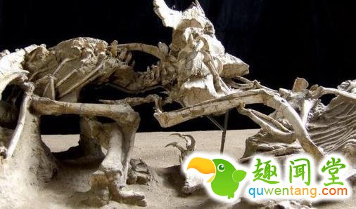 1971年,考古学家发现7400万年前的恐龙骨骼化石,呈现两只恐龙在山体滑坡掩埋之前曾激烈争斗。迅猛龙将锋利爪子插入食草恐龙原角龙脖颈,可能导致致命性的颈动脉破裂,而在此之前,原角龙将迅猛龙压在地面上,爪子紧紧地锁住迅猛龙的右前肢。